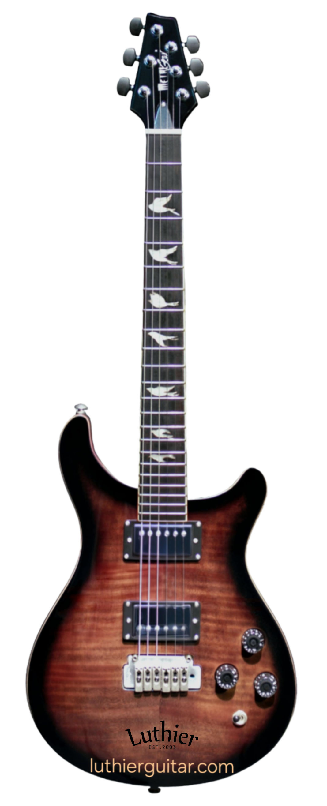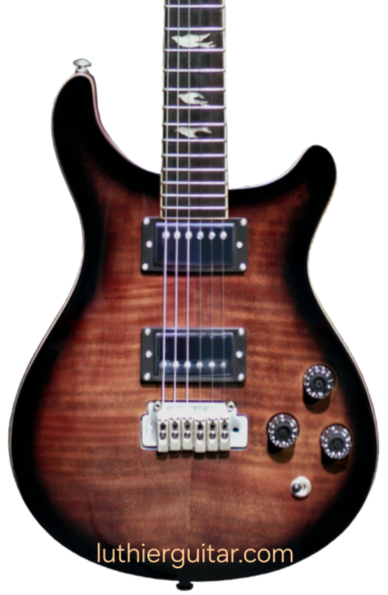 Dual cutaway Flame-maple BlackSunBurst (FPSB) Top, with solid Mahogany body, Wilkinson 2H X 2 PickUps with steel plates cover, Wilkinson Tremolo Bridge, elegant doves inlays fretmarks. Ebony head machines to match the head stock style.