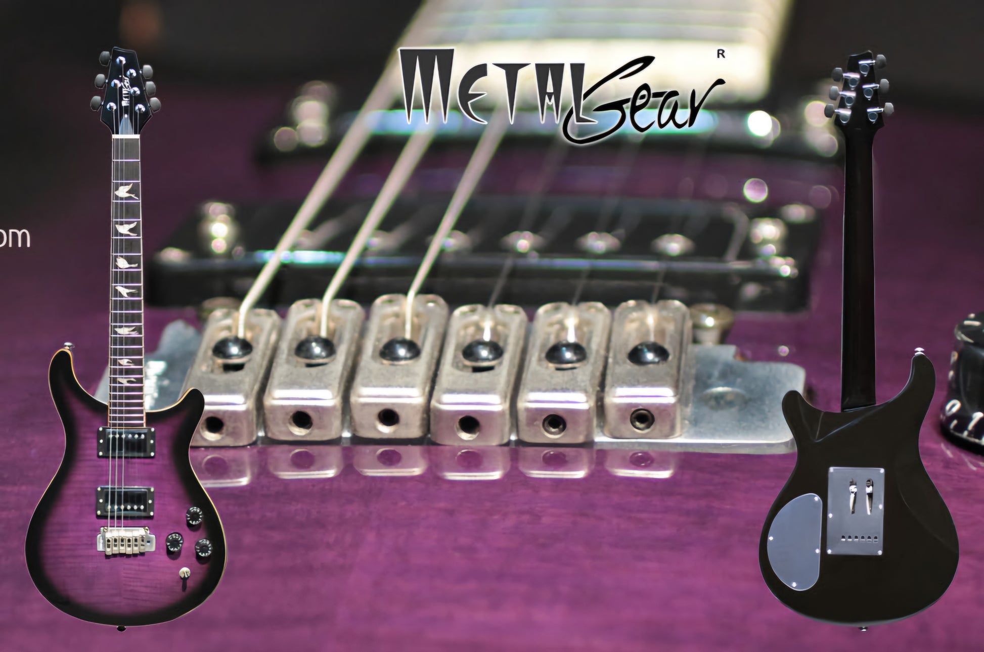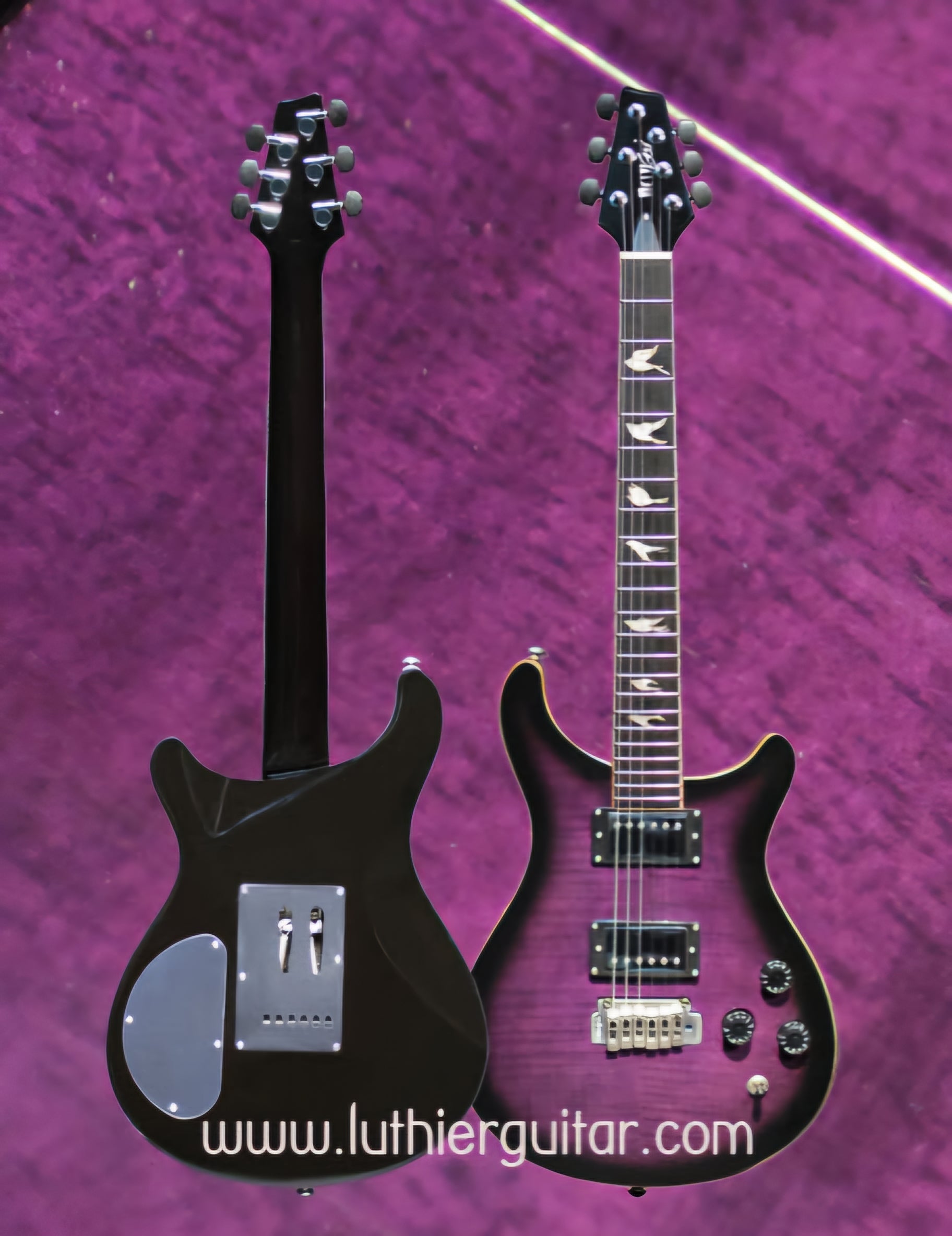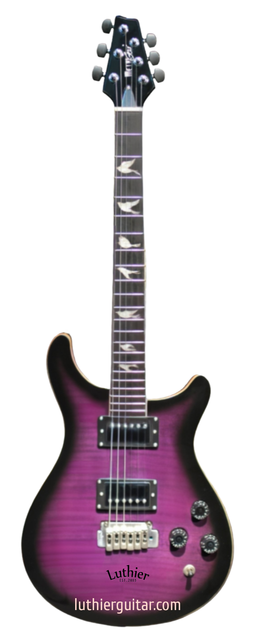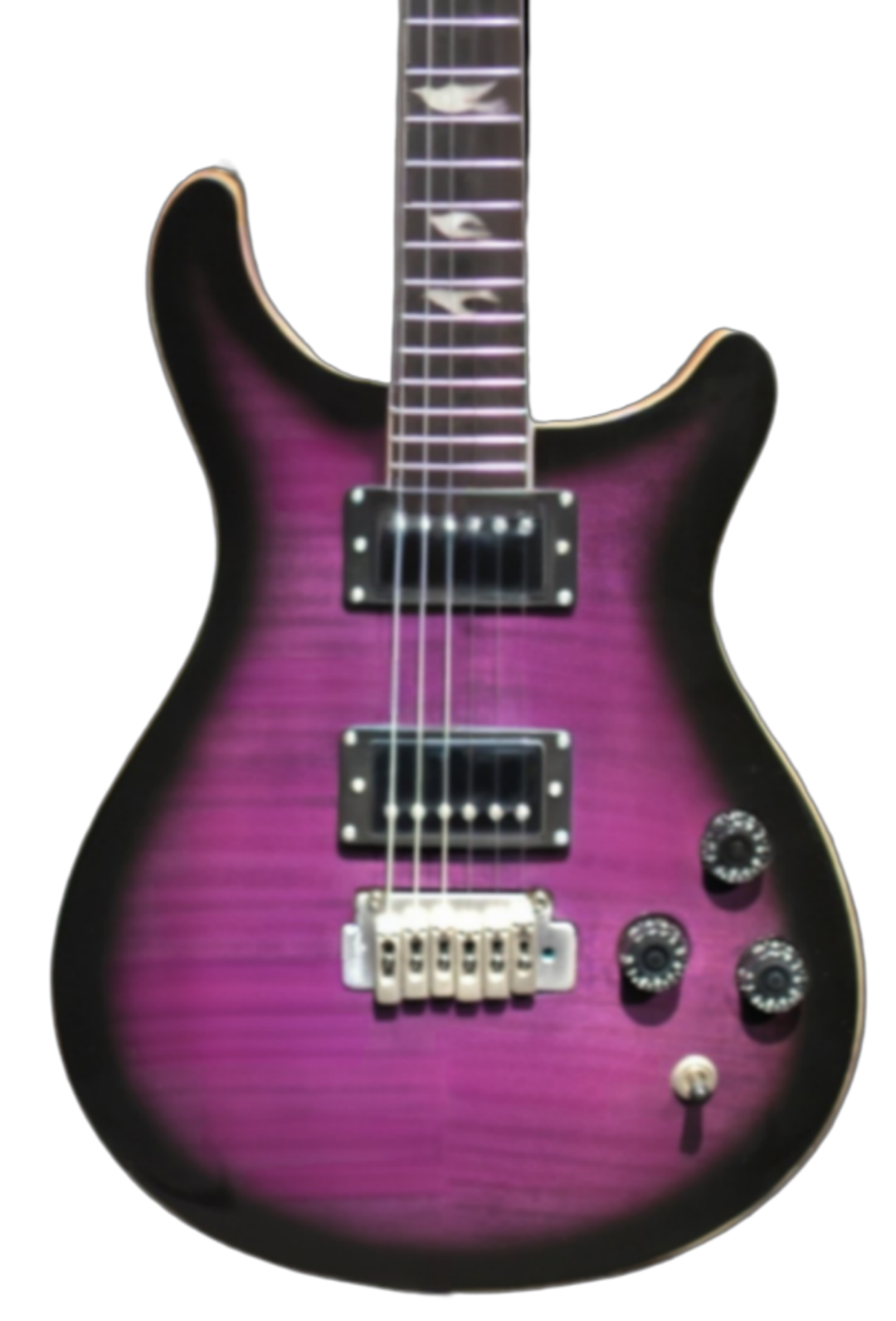 Dual cutaway Flame-maplePurpleSunBurst (FPSB) Top, with solid Mahogany body, Wilkinson 2H X 2 PickUps with steel plates cover, Wilkinson Tremolo Bridge, elegant doves inlays fretmarks. Ebony head machines to match the head stock style.