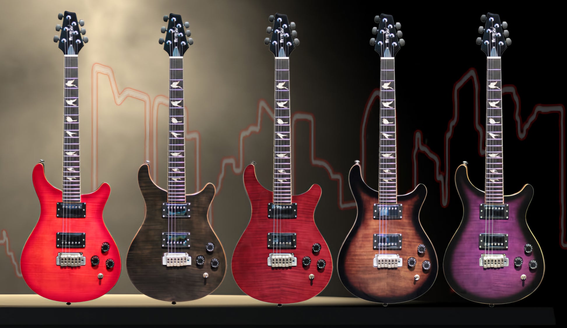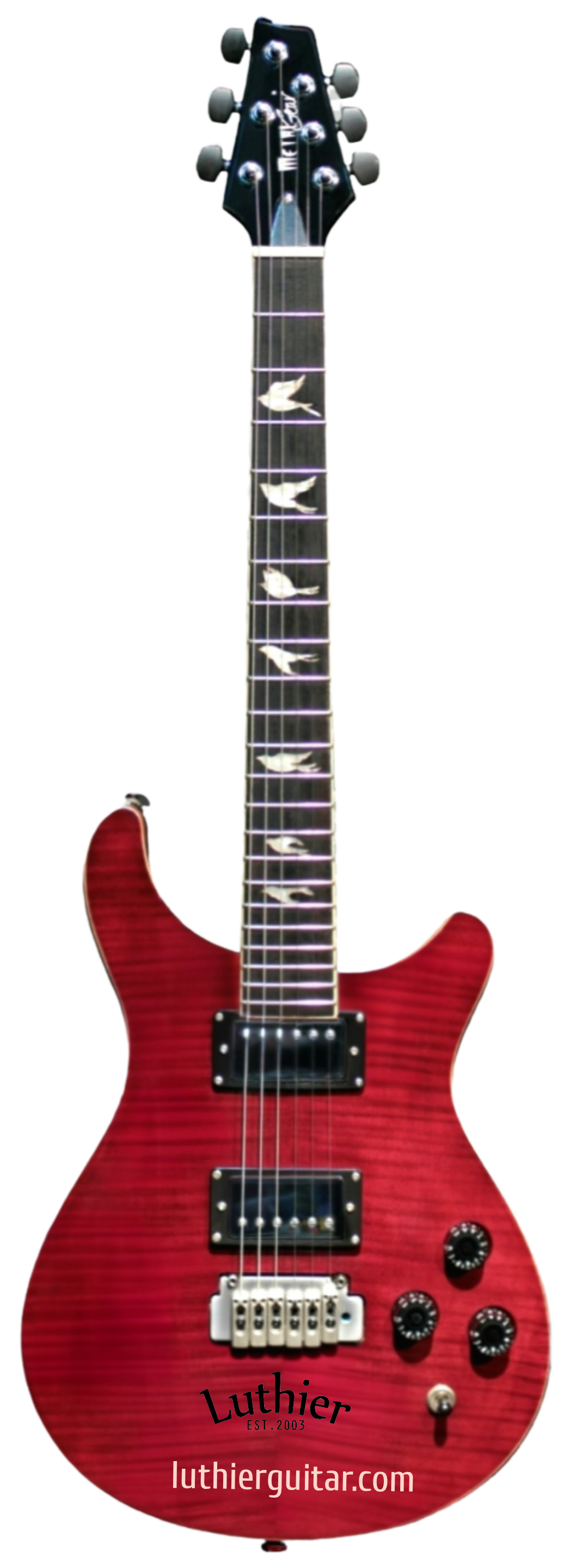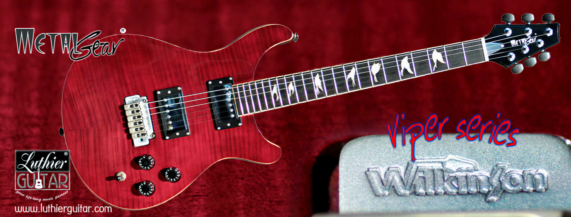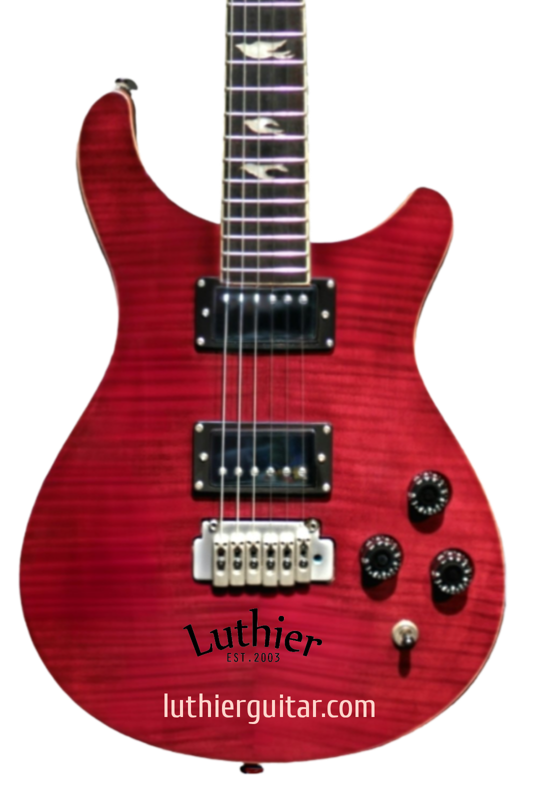 Dual cutaway Flame-mapleWineRedSeethru (FWRS) Top, with solid Mahogany body, Wilkinson 2H X 2 PickUps with steel plates cover, Wilkinson Tremolo Bridge, elegant doves inlays fretmarks. Ebony head machines to match the head stock style.