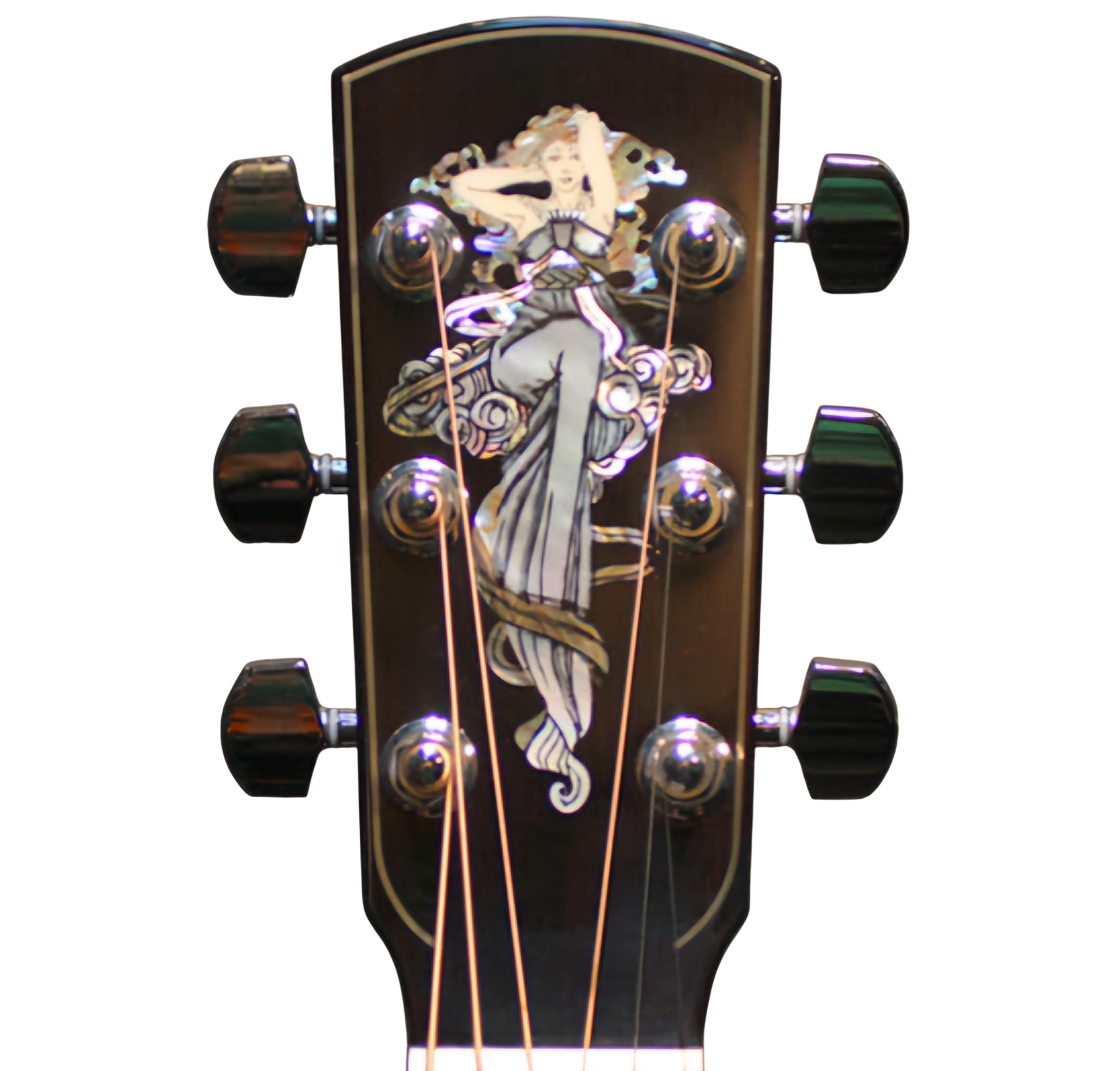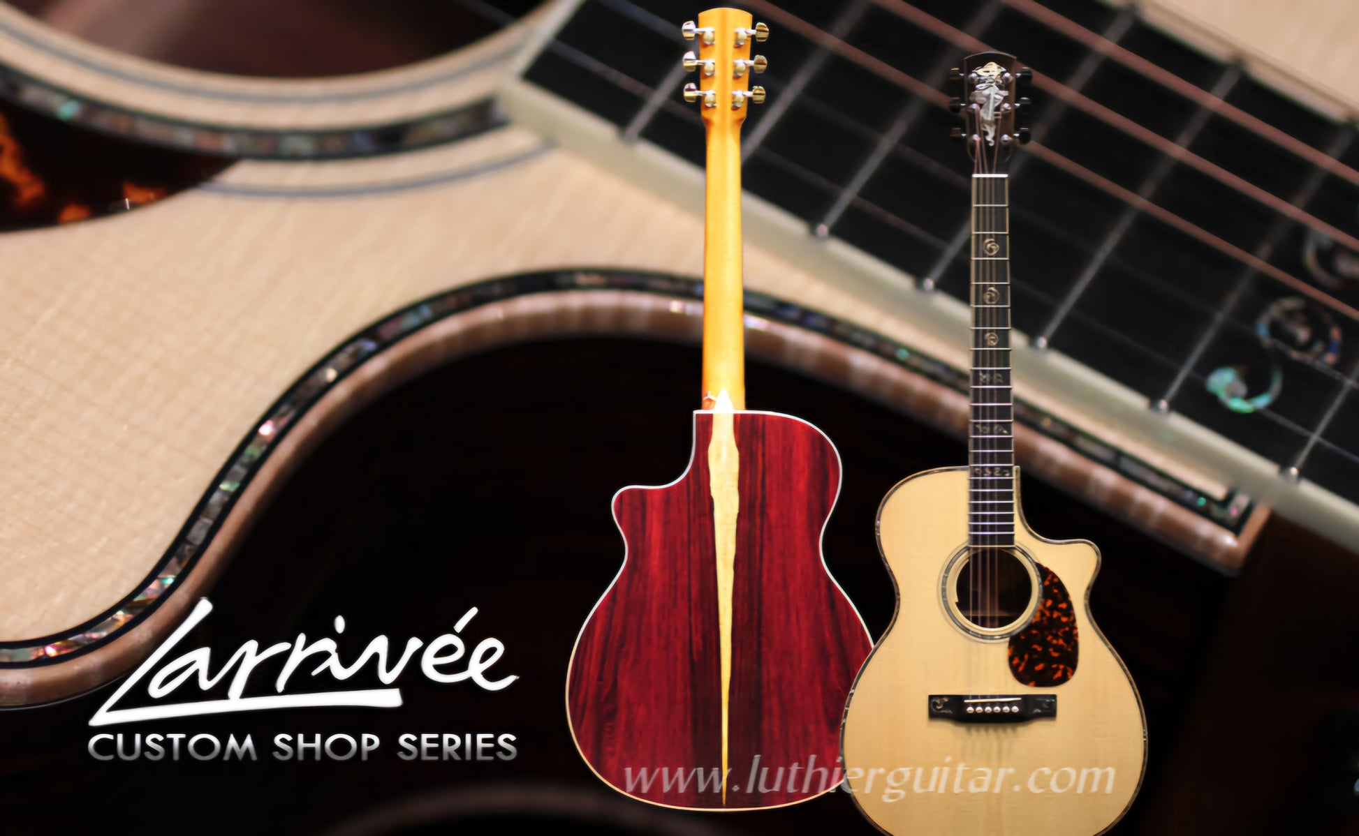 Paired with Wendy Larrivée's exacting and elegant inlay work down the head stock of "Mucha" inlays, the proprietary fingerboard and bridge inlays wings, the Deluxe Series are true works of playable art.